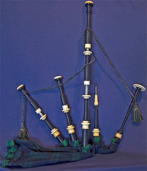 | Bag Pipes with Lawrie Chanter dated 1925 | An attractive set of bag pipes made by Peter Henderson hallmarked: P.H, City Of Glasgow, Scottish Lion, Thistle and "C" for the year 1925. The chanter is made by R.G. Lawrie and stamped R. G. Lawrie, Glasgow. The bag is very soft. All drone and chanter reeds are present. There are no visible damages. These bag pipes have been set-up to be played professionally and then were prepared for long time storage in the late 80s. The instrument has been in storage ever since, not been played at all. | ![]() ![]() |